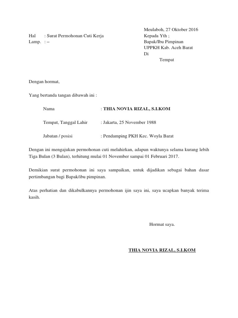 Semoga melahirkannya nanti lancar,,,, ibu dan anaknya sehat. Demikian contoh surat permohonan izin cuti melahirkan untuk pegawai honorer. The collection that consisting of chosen picture and the best among others. Penulisan surat izin cuti melahirkan tidak jauh berbeda dengan penulisan berbagai jenis dan contoh surat cuti lainnya. Merujuk ke uu ketenagakerjaan, pasal 82, cuti melahirkan merupakan hak bagi karyawan. Karena memang pada dasarnya seorang karyawan akan diberikan jatah libur di luar hari libur, maka tidak ada salahnya untuk menggunakan waktu tersebut untuk mengambil cuti. Hal ini akan membuat mereka membutuhkan waktu untuk berhenti bekerja atau cuti sementara. Aug 02, 2021 · 4 contoh surat cuti melahirkan yang benar untuk pns, guru dan karyawan swasta. Jika kantor atau perusahaan tempat kamu bekerja tidak menyediakan formulir khusus untuk mengajukan cuti melahirkan, kamu bisa mengikuti format contoh surat cuti melahirkan berikut ini. Sella melati on agustus 3, 2021. Namun jika memungkinkan, anda bisa melampirkan surat keterangan hasil pemeriksaaan bidan atau dokter kandungan pada saat mengajukan contoh surat cuti melahirkan … Pengambilan cuti sementara ini dipersiapkan untuk para perempuan agar bisa menyiapkan proses persalinan tanpa harus memikirkan … Ketika karyawan perempuan hamil dan akan melahirkan, karyawan tersebut berhak mengajukan cuti hamil melalui surat cuti melahirkan.